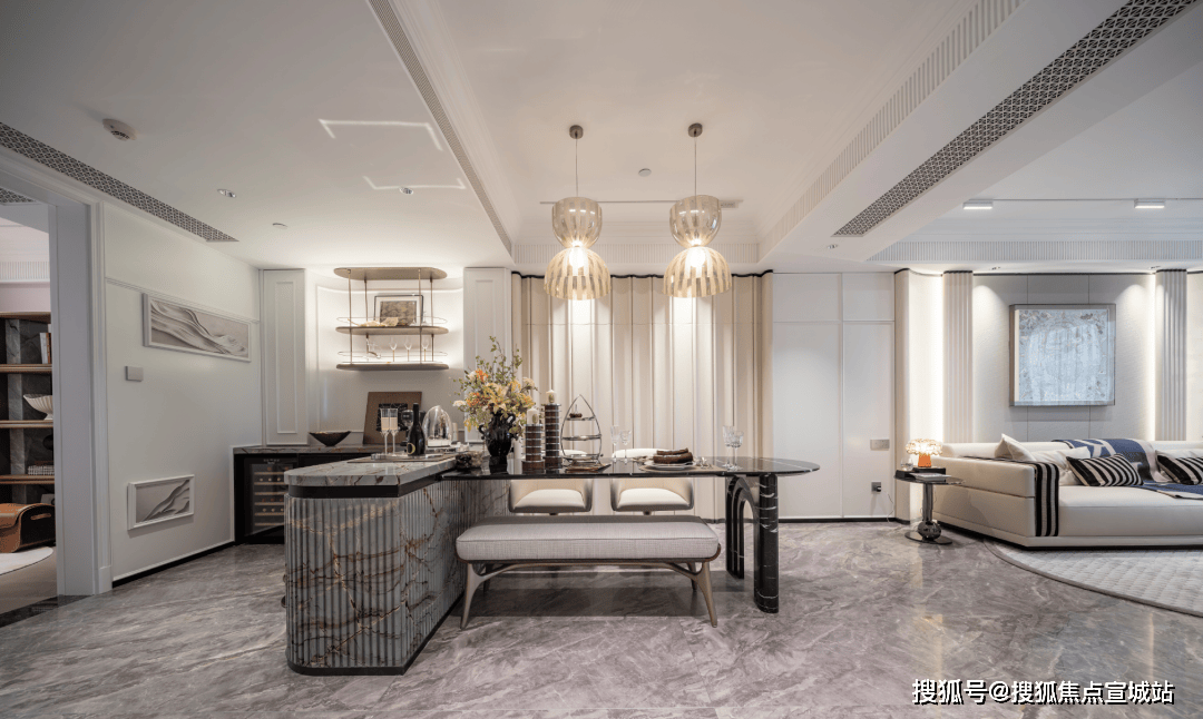 背景墙比别人更多一点。天然石材的电视背景墙,高级大气;编织皮革的客厅背景墙,充满质感;过度用的是白色木饰纹的背景墙,简约耐看;餐厅处又是白色皮革背景墙,大方优雅。整个空间过渡自然,增加了层次感和高级感。
