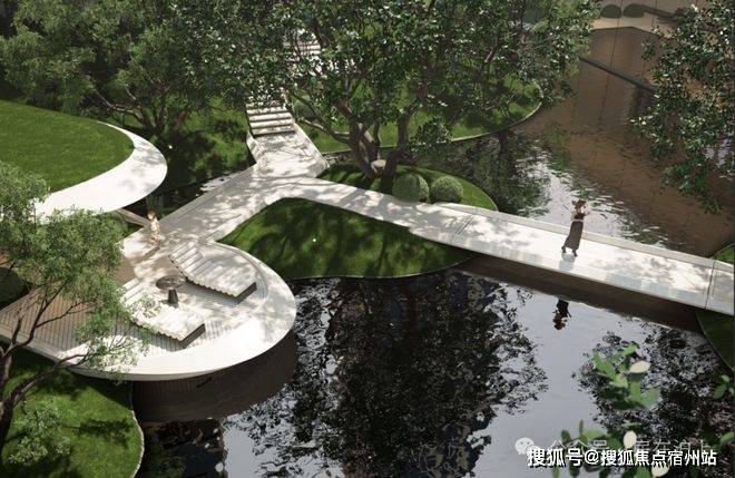 穿过园林,上海最大的约3500㎡下沉水院构成社区的核心灵魂,约13米的高差形成独特的“峡谷绿洲”,将黄浦江的水意象引入社区,中央平静水面与四周的会客舱、茶室、游泳馆形成呼应。